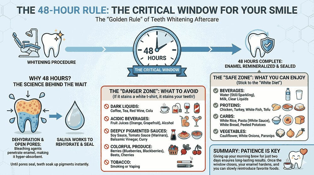 Coffee is the main focus, but it’s not the only thing you need to be cautious about after a teeth whitening treatment. During that critical 48-hour period, you should follow what is commonly known as the “white diet.” The rule of thumb is simple: if it can stain a white shirt, it can stain your teeth.